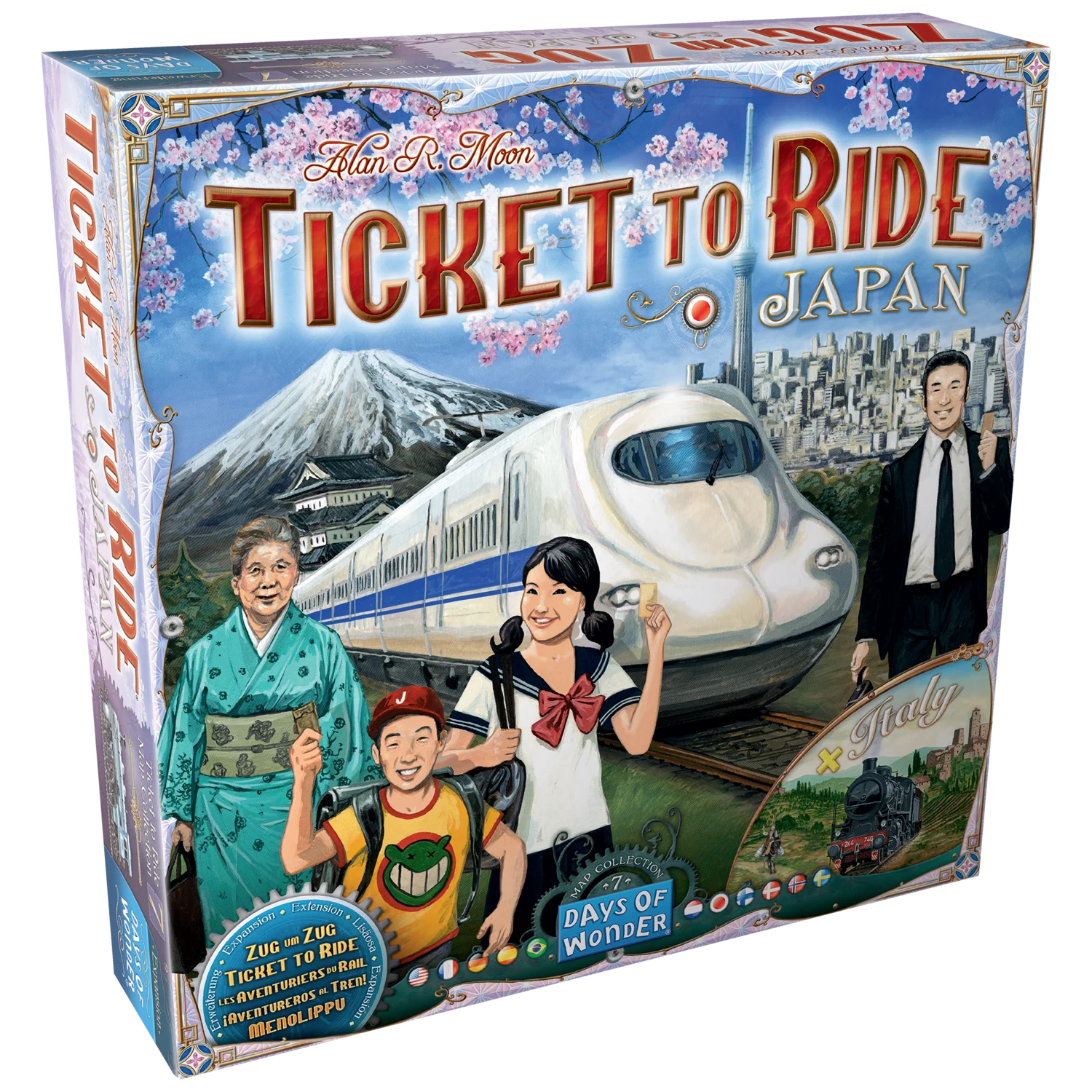 Ticket to Ride Japan & Italy includes the largest Ticket to Ride board yet! On the Japan map, players face a dilemma between investing in the Bullet Train network, which can be used by all players, or focusing on their individual tracks. The Italy map is focused on the country’s Regions and on a new type of Ferry Route. Connect cities from all Regions in the same network to score extra points.